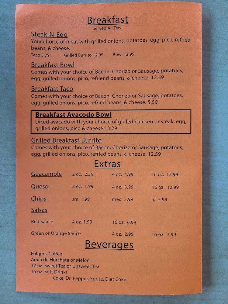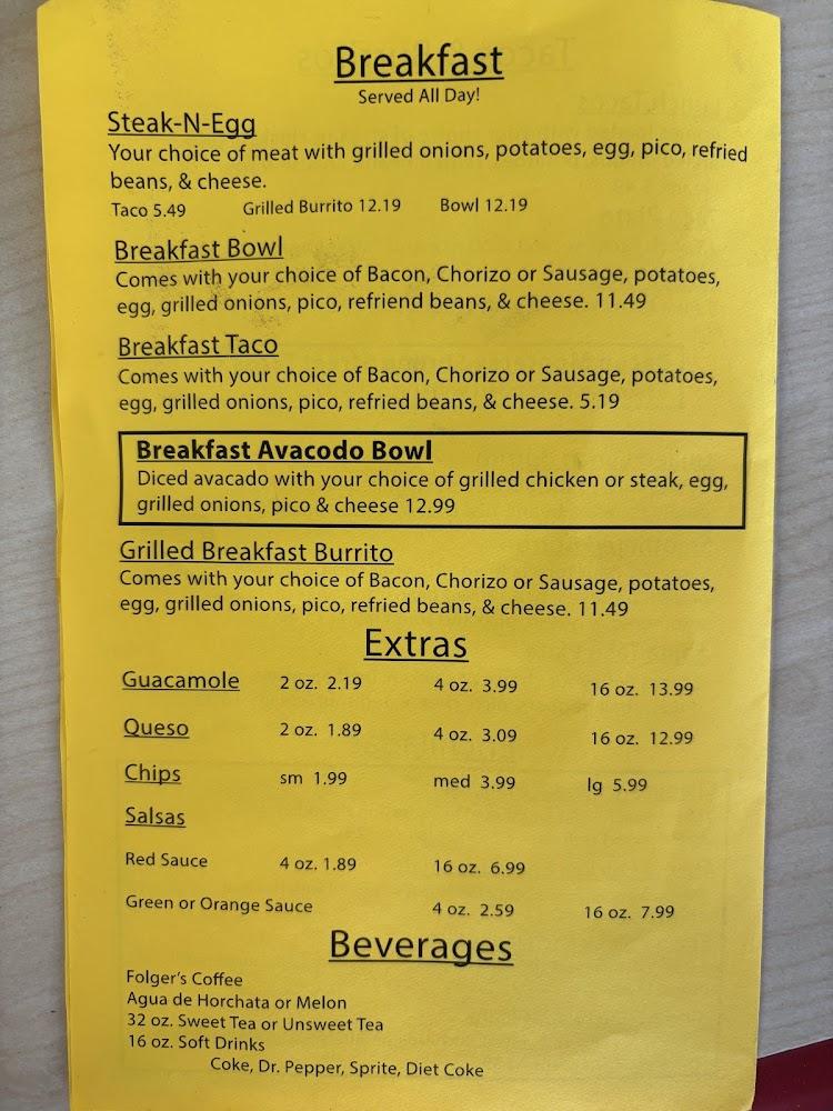 The menu at Tacos By The Trax presents a variety of traditional Mexican dishes. Breakfast tacos shine, featuring fillings from brisket to spicy sausage. Tacos for lunch include beef, chicken, and vegetarian options. Don't miss the avocado bowl for a fresh, healthy choice. Favorite extras include guacamole and queso, rounding out the meal perfectly.